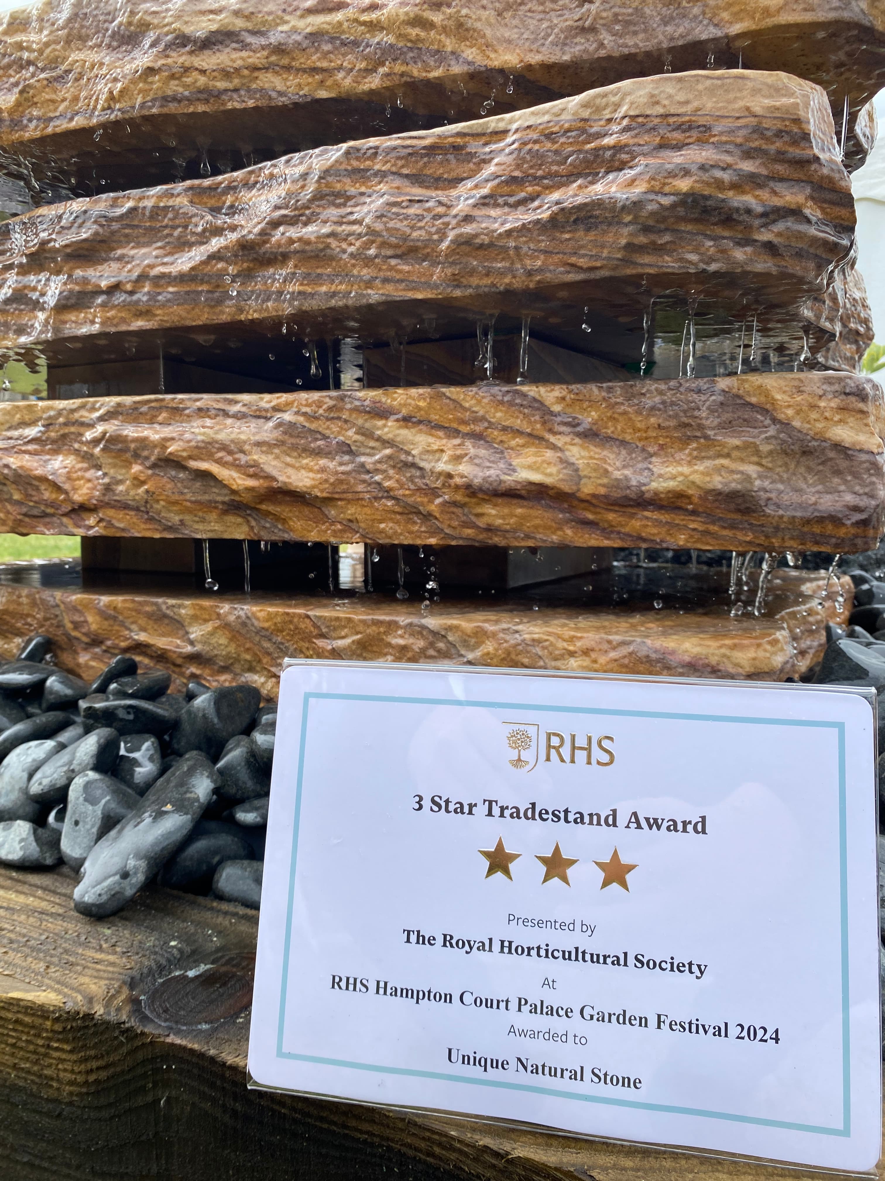 Unique Natural Stone are delighted to receive 3 Stars ('Very Good') for our trade stand at RHS Hampton Court 2024. This is greatly appreciated by the many individuals who worked so hard to showcase our items to such a beautiful standard.