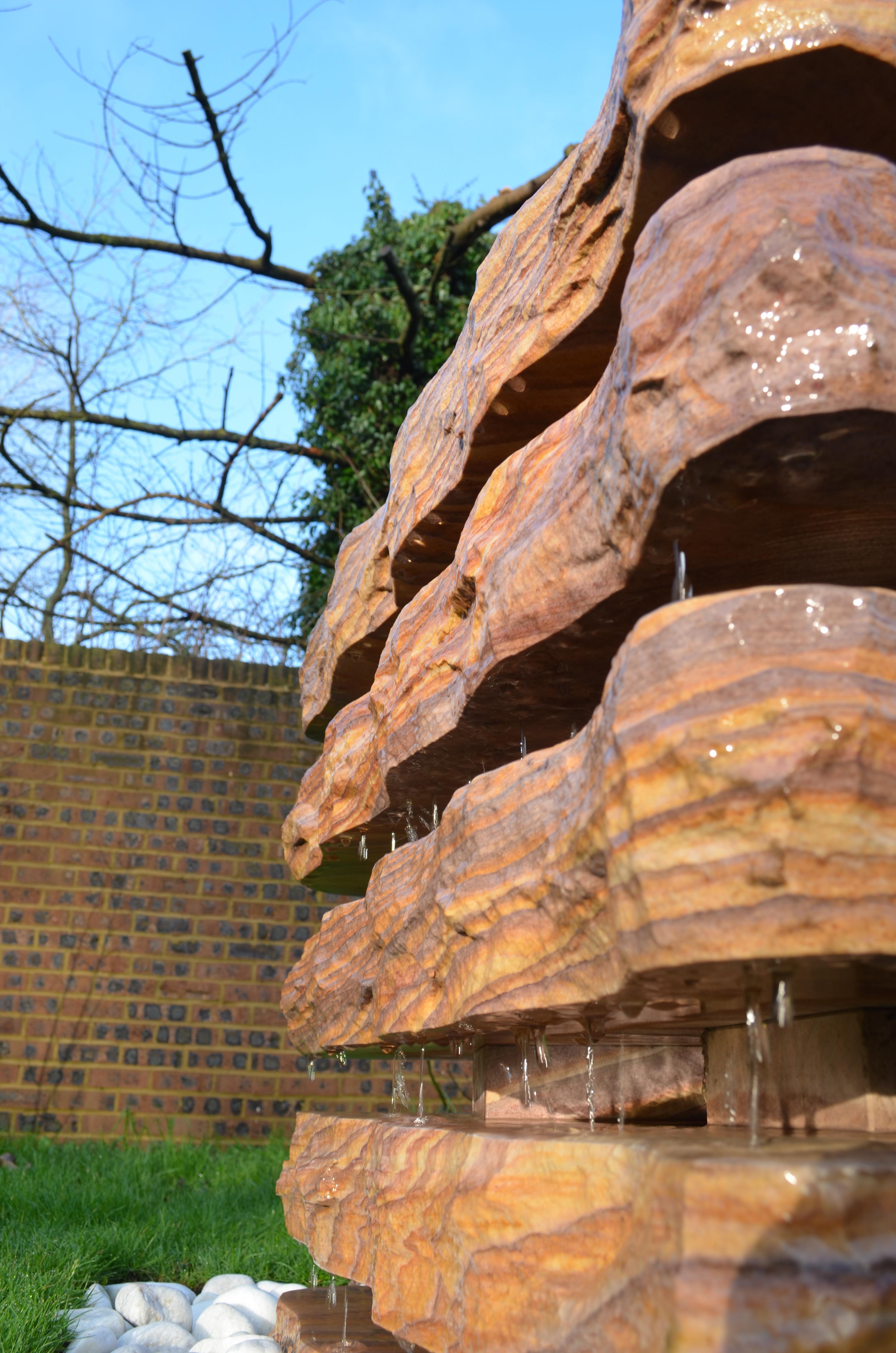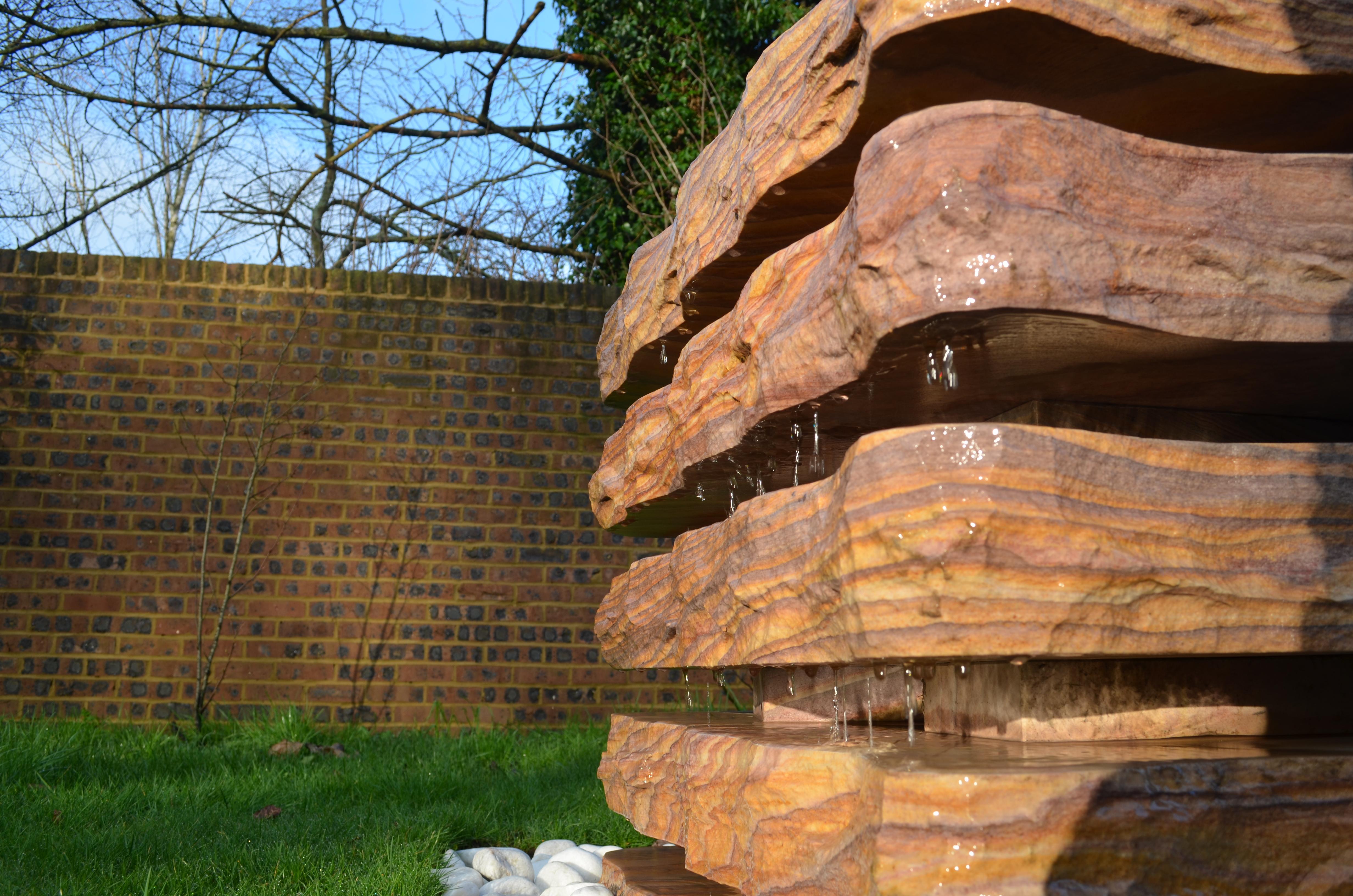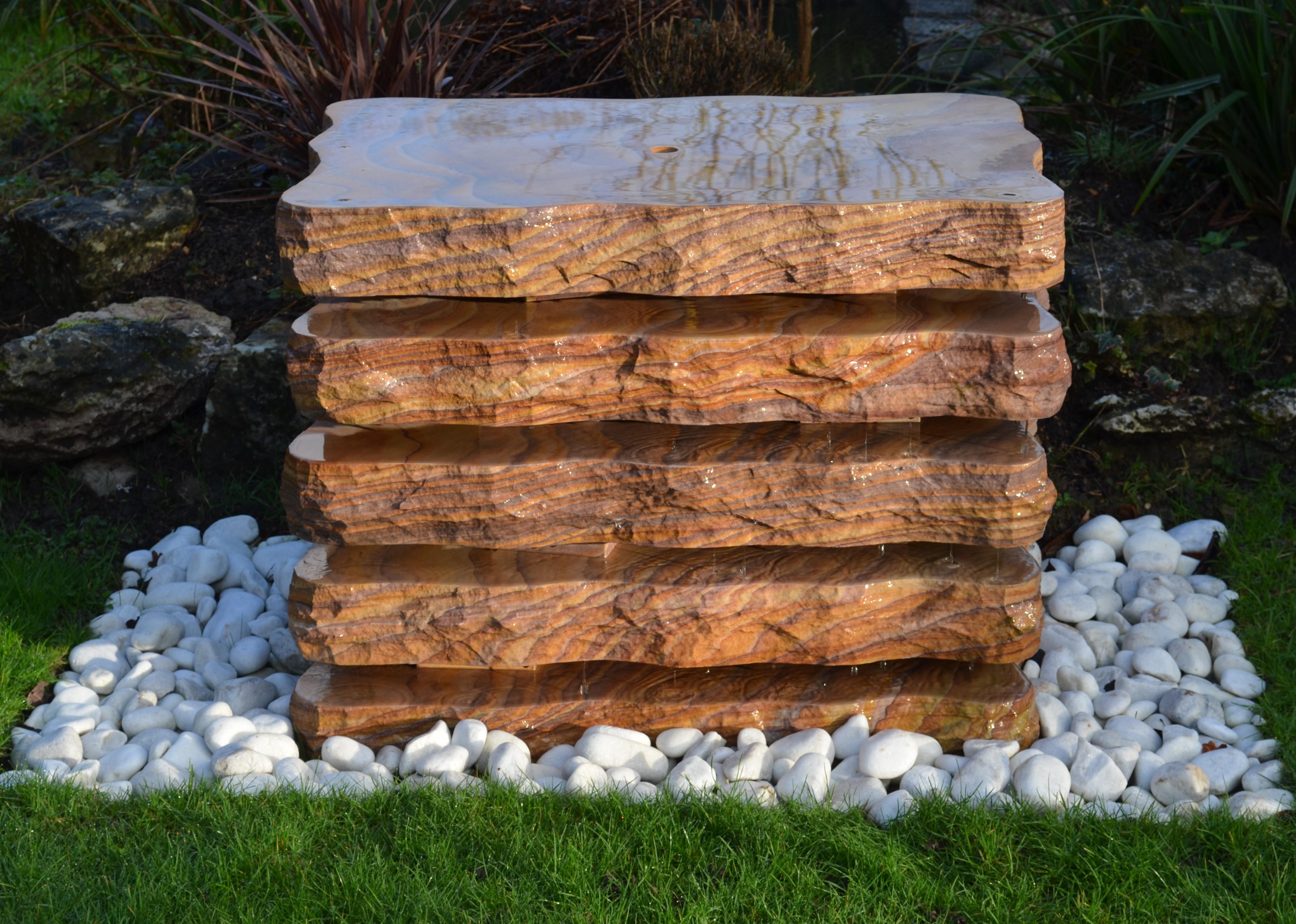 A beautiful water fountain made up of 5 separate blocks of Rainbow sandstone granite. The gaps between the blocks allow for a beautiful vision between the varying characters of the natural stone blocks, along with the timeless tranquillity of the water dripping between down the feature.